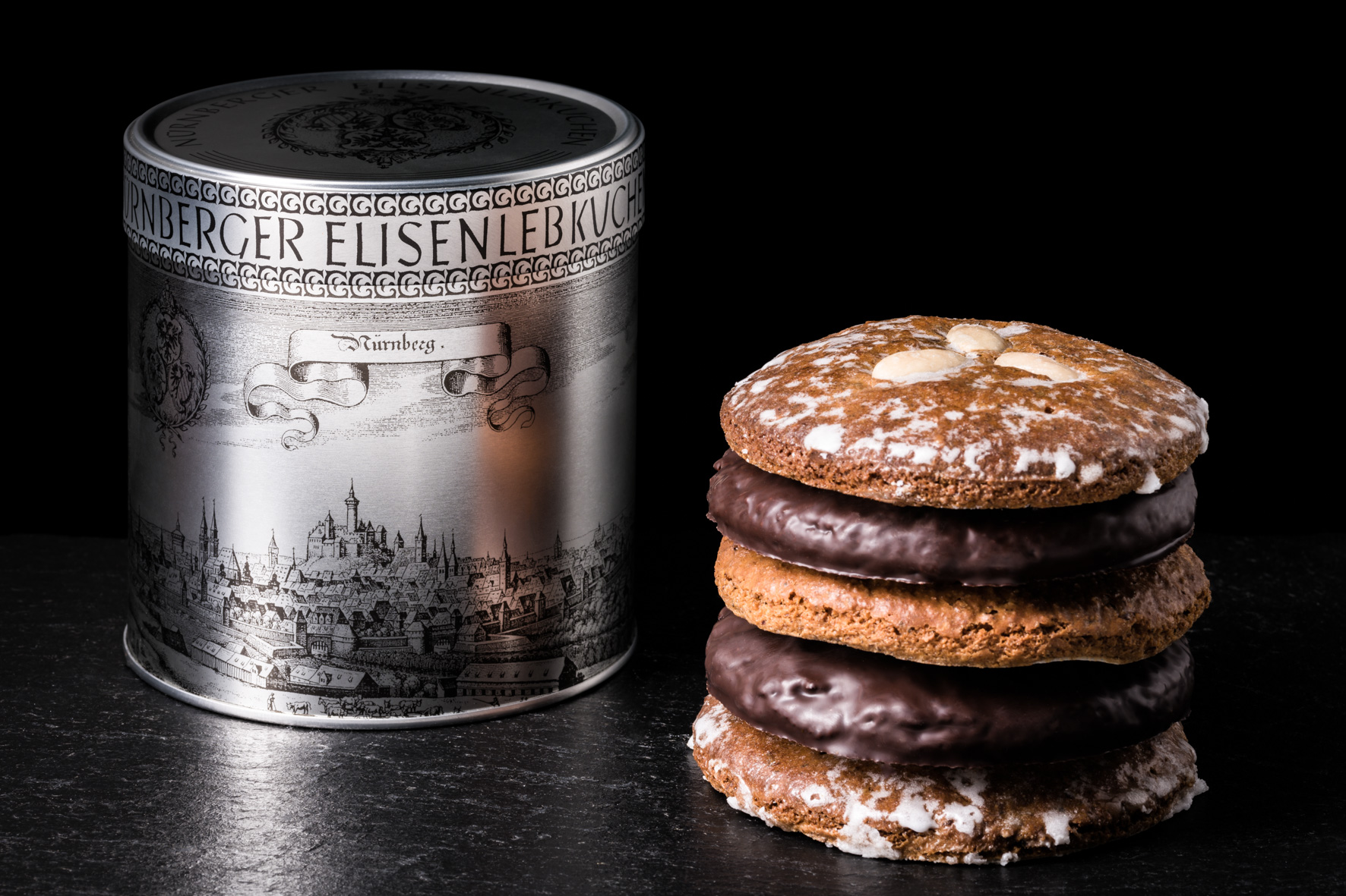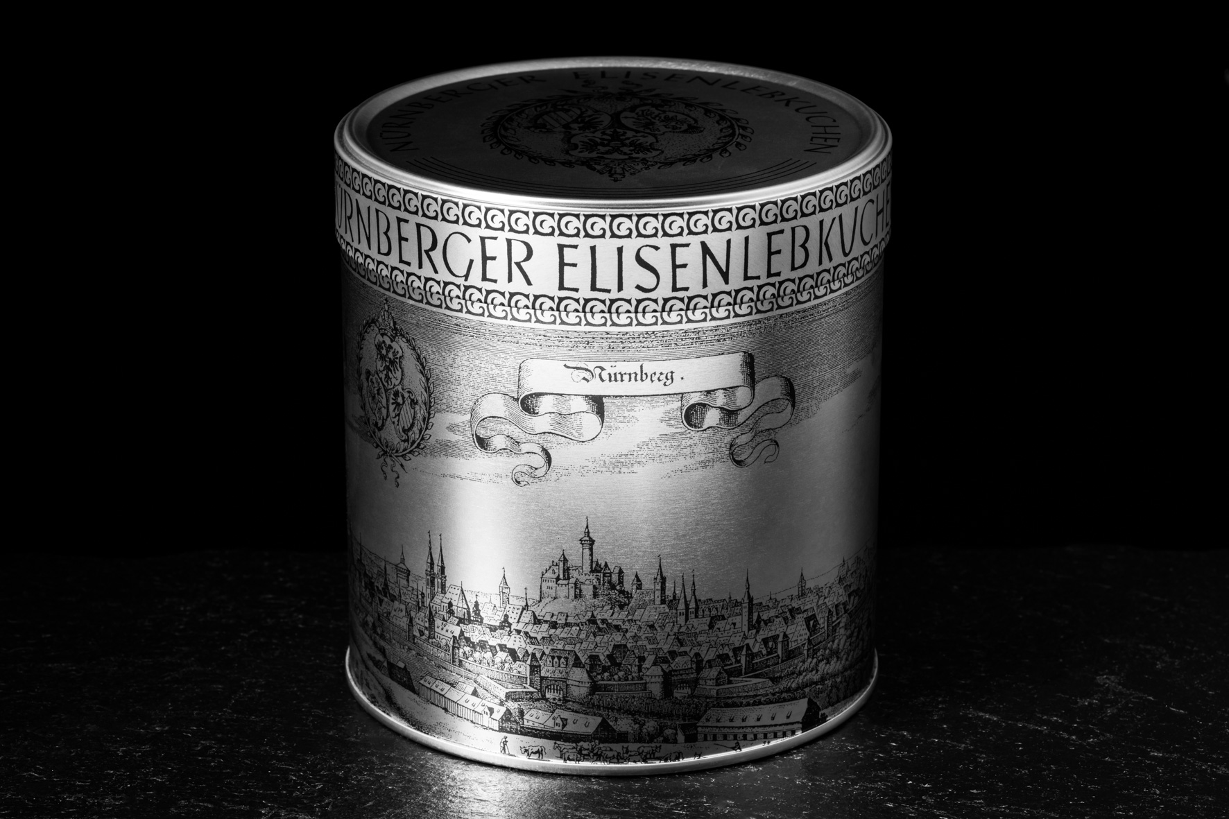 Unsere klassische Nürnberger Silberdose im nostalgischen Design. Gefüllt mit Original Nürnberger Konditoren Elisenlebkuchen gemischt 400g, bestehen aus einer erlesenen Sortierung aus zwei schokolierten, zwei zuckerglasierten und einem naturbelassenen handwerklich gefertigten Elisenlebkuchen. Hergestellt aus den feinsten Zutaten nach alt hergebrachten Rezept. Unsere Nürnberger Silberdose, klassisch und traditionell.